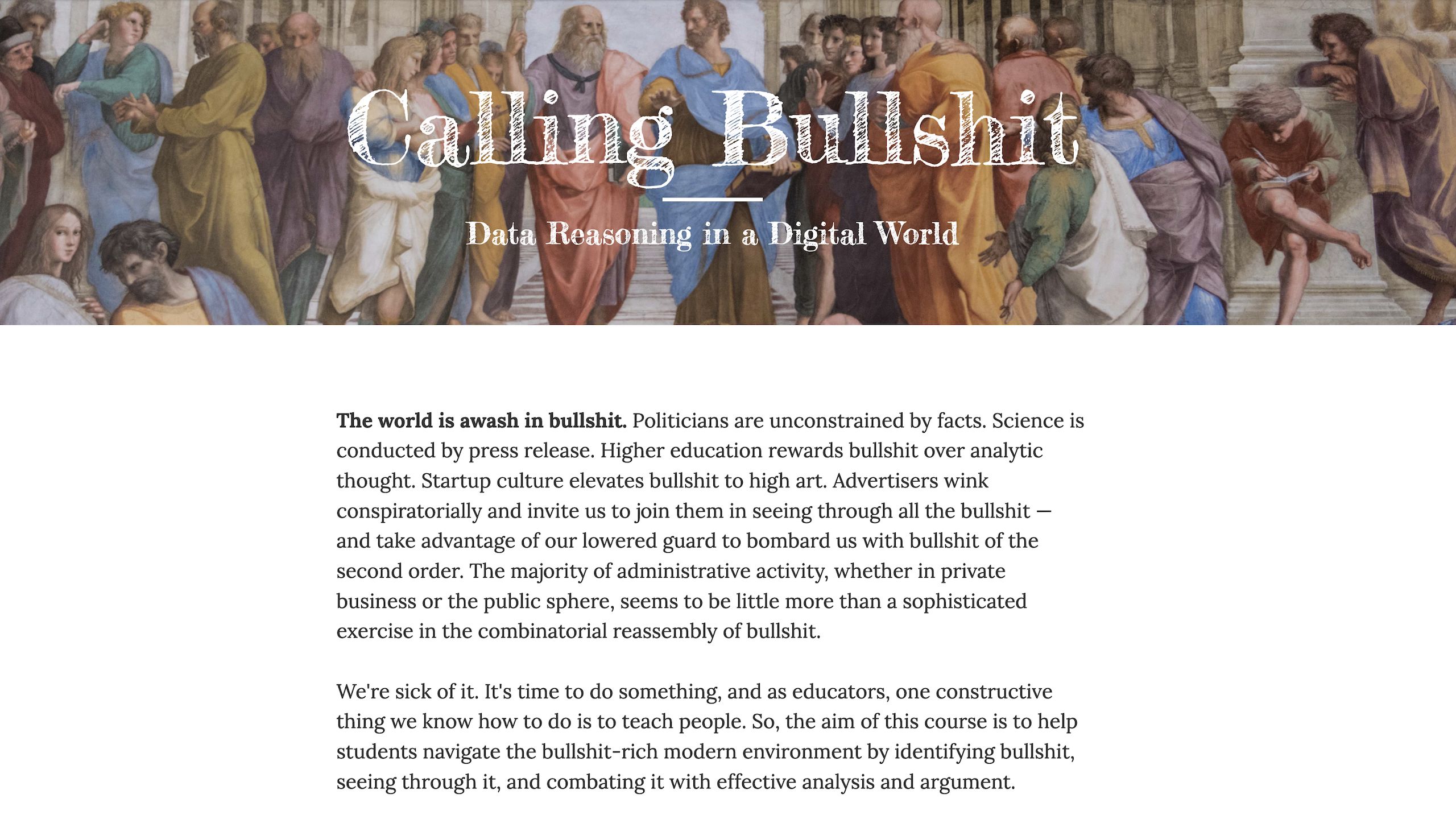 This is our second major project in curriculum development. In 2014, we started talking about how data and statistical analysis — the keystones of scientific reasoning — can be abused to mislead people. Drowning in information, people become exhausted. Confronted with the false authority of numbers, people feel disempowered to question what they are being told. We know that one does not need a technical background to ask questions, see through the bullshit, and fight back — and we designed a curriculum to empower our students and readers to do exactly that: Calling Bullshit.