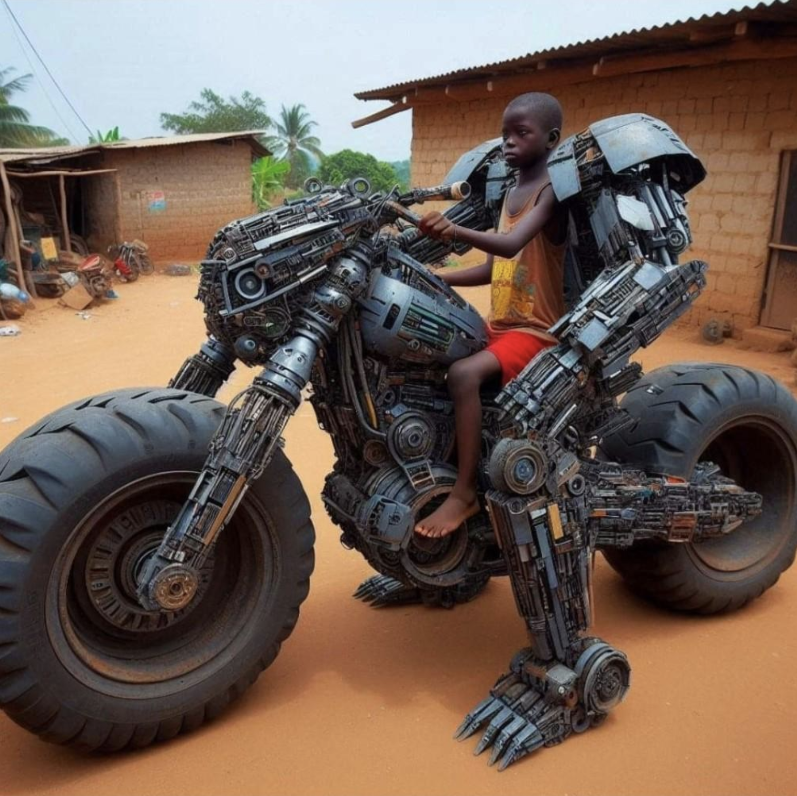 AI image of a child on a strange motorbike with legs that looks half Transformer, half Mad Max.